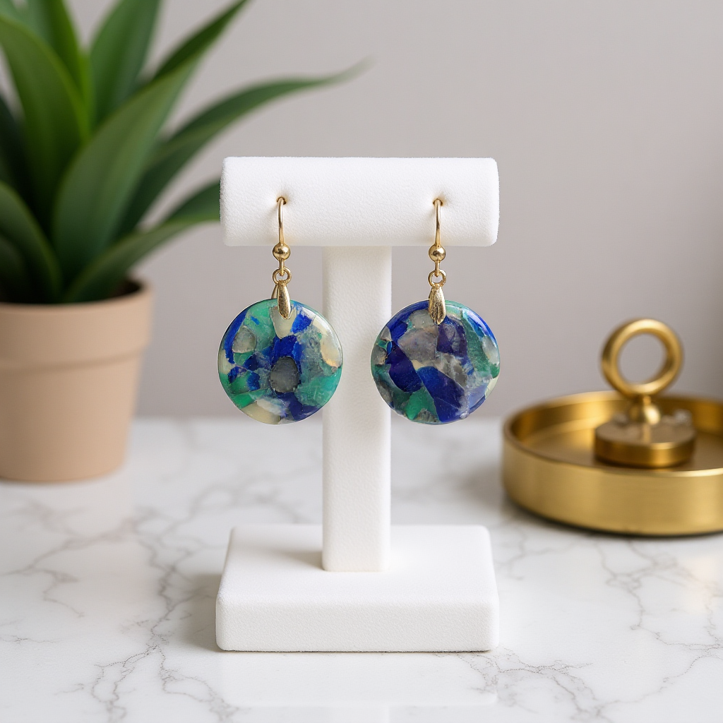 Beautiful round earring with multiple shades of blue with a touch of translucent.